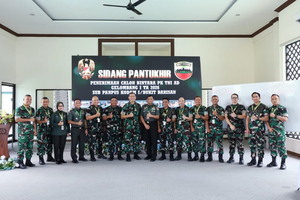 Pematangsiantar (WartaDhana.Com): Pangdam I/Bukit Barisan Mayjen TNI Hendy Antariksa memimpin kegiatan Sidang Pantukhir Pusat Penerimaan Calon Bintara (Caba) PK TNI AD Gelombang I TA 2026 tingkat Sub Panpus Kodam I/BB di Lapangan Tennis Indoor Rindam I/BB, Pematangsiantar, Kamis (19/2/2026). Setibanya di Rindam I/BB, Pangdam menerima laporan dan penghormatan jajar sebelum kegiatan dimulai.