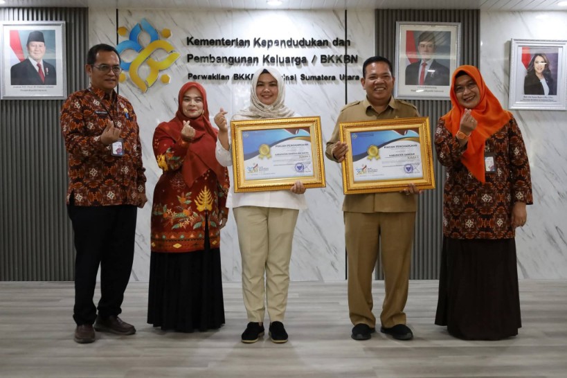 Piagam penghargaan diterima oleh Wakil Bupati Atika Azmi Utammi Nasution dalam agenda Rapat Pengendalian Program dan Anggaran di Aula Perwakilan BKKBN Sumut pada Selasa, 28 April 2026.